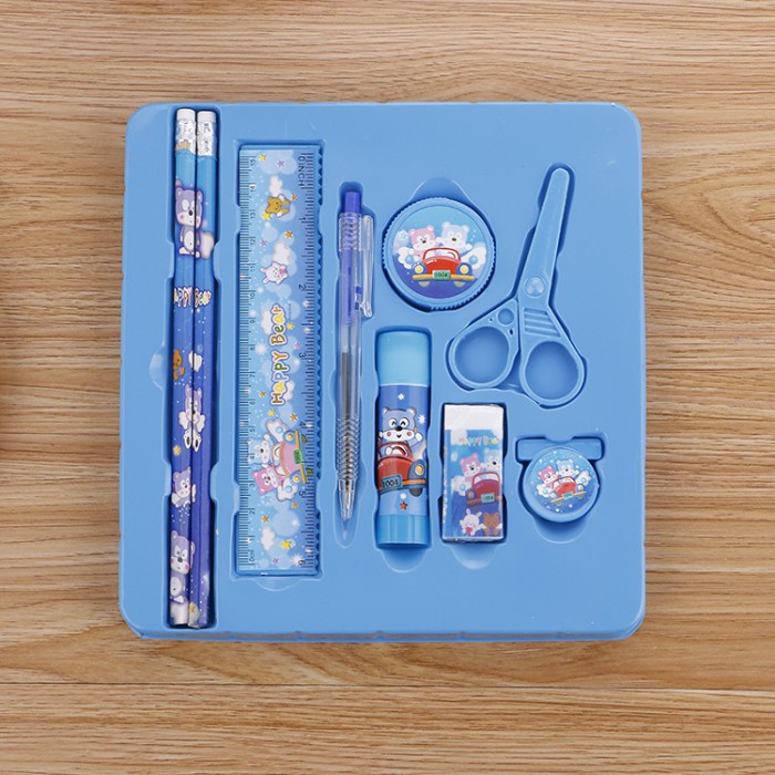 9 pcs/set termasuk 2 * pensil, 1 * klip, 1 * penghapus, 1 * rautan, 1 * penggaris, 1 * pulpen, 1 * lem padat, 1 * gunting plastik. Pencil Stationery sangat cocok untuk melengkapi perlengkapan sekolah anak Anda. Cocok juga untuk hadiah.