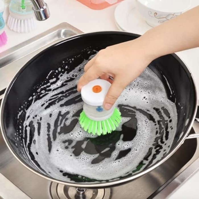 Alat sikat panci inovatif ini dilengkapi dispenser sabun cair. cukup tekan, maka sabun akan keluar otomatis. dengan sikat halus, membantu membersihkan kotoran membandel. jika sikat sudah aus, lepaskan dari tempatnya dan bisa diganti dengan sikat halus yang baru.