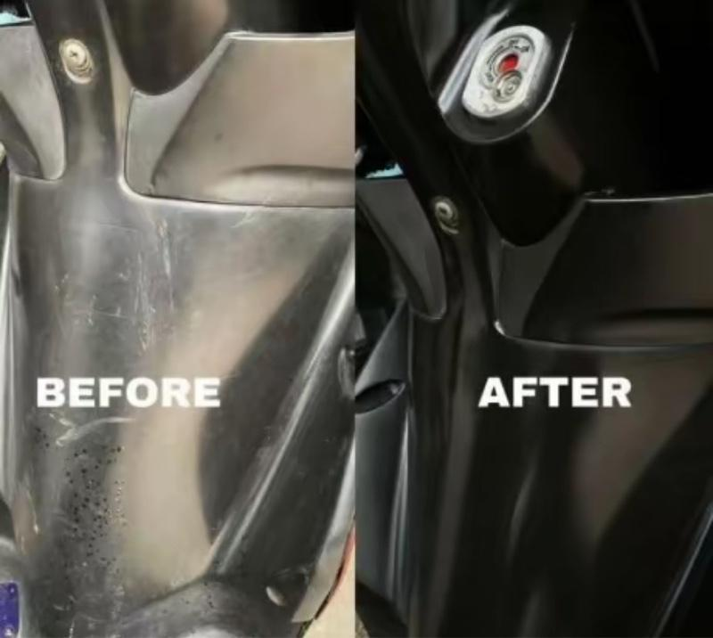 Cairan perawatan motor penghitam body membantu mengembalikan warna hitam pekat pada plastik trim yang pudar akibat panas matahari, sering dicuci, atau teroksidasi.