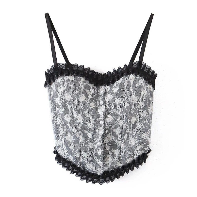 Croptop Lace Floral Retro Tanktop Wanita Gaya Korea – Hitam