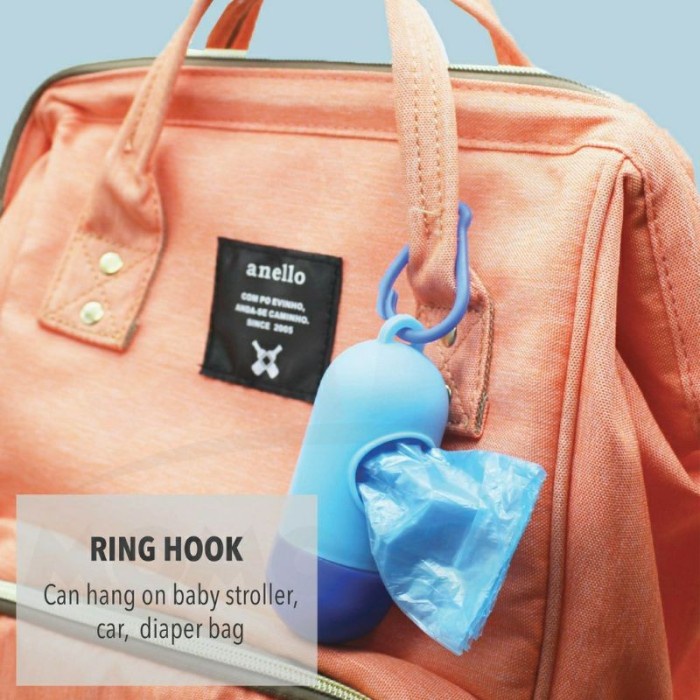 Dispenser portable tempat penyimpanan kantong pembuangan sampah / pampers bekas, sangat ringan sehingga nyaman di bawa kemana pun juga. Produk dilengkapi dengan gantungan sehingga bisa digantung pada tas maupun stroller bayi. Kini tidak perlu khawatir kelabakan mencari kantong kresek untuk membuang pampers bayi lagi, sediakan selalu dalam dispenser ini.