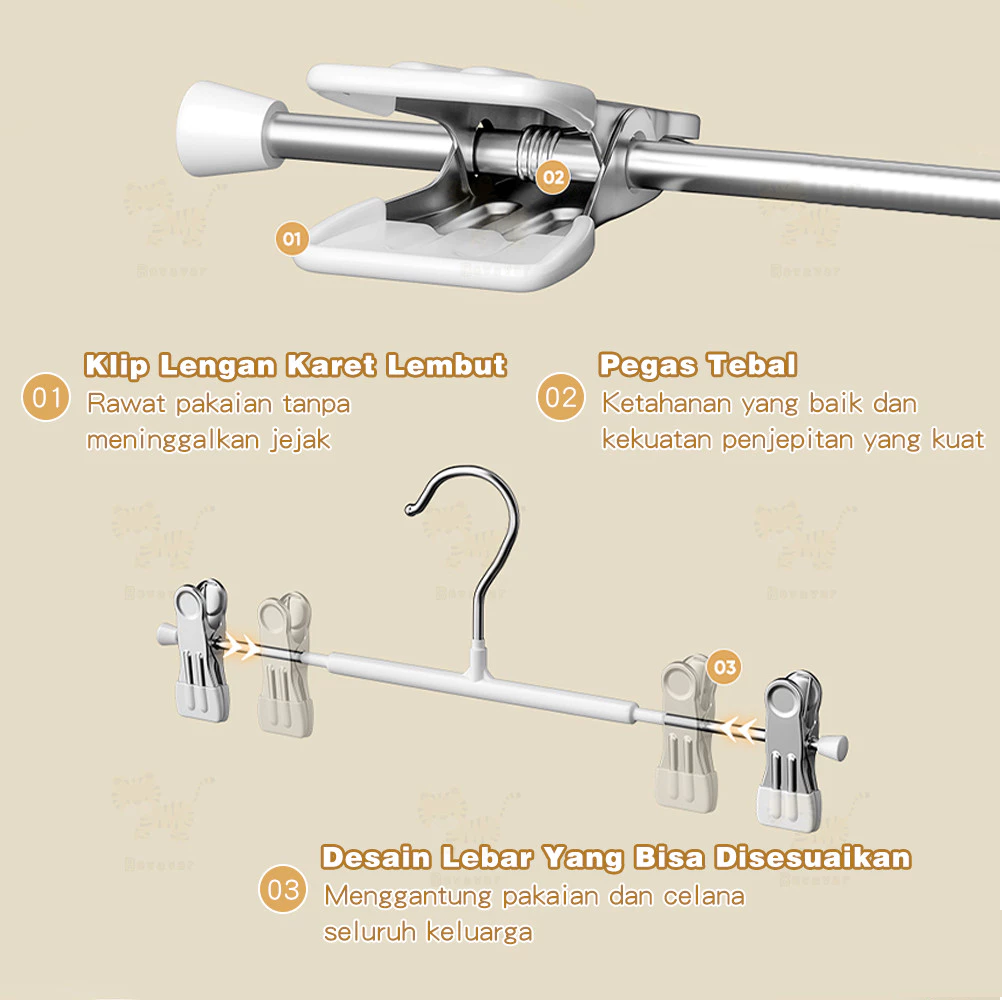 Dilengkapi dengan klip yang dapat diputar 360° dan lapisan karet anti-slip, produk ini cocok digunakan baik untuk kebutuhan pribadi di rumah maupun untuk usaha laundry.