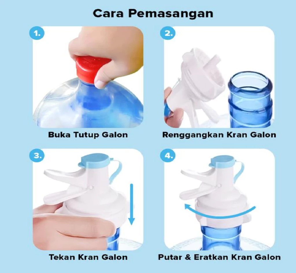 – Mudah Dipasang: Cukup diputar dan ditekan pada mulut galon tanpa alat tambahan.