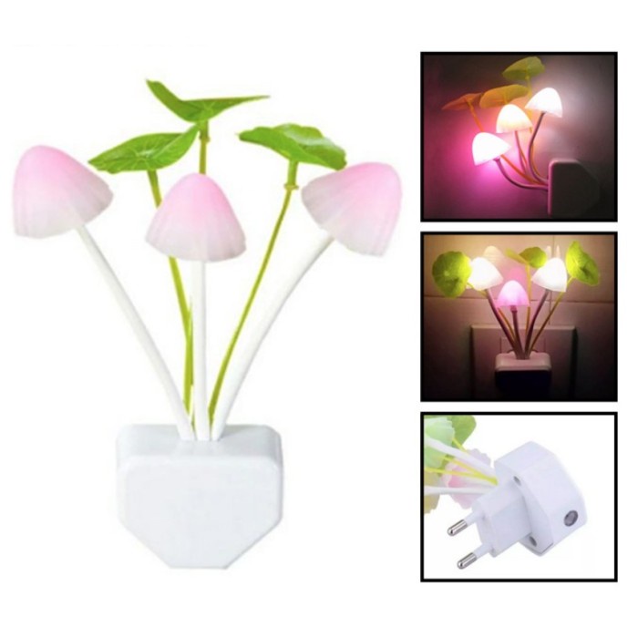 3 jamur yang lucu akan menyala dengan 3 warna: pink, kuning dan ungu.