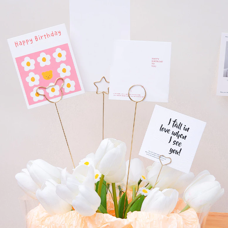 Stick Card Klip Kartu Ucapan adalah aksesori elegan yang dirancang untuk menyematkan kartu ucapan pada buket bunga, gift, hampers, atau dekorasi Lebaran.