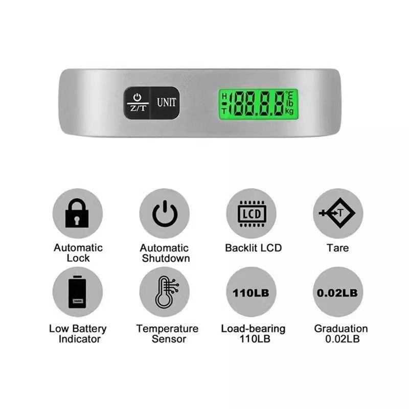 Timbangan koper digital ini berguna untuk mengecek berat bagasi sebelum masuk bandara agar terhindar dari biaya kelebihan muatan. Desain genggam yang ringan dengan layar LCD membuat timbangan ini praktis dibawa saat traveling dan mudah dibaca hasil timbangannya.