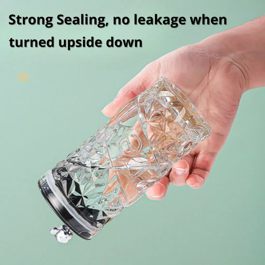 Tumbler botol kaca ini hadir dengan desain motif kristal yang elegan dan tutup berbentuk beruang yang unik.