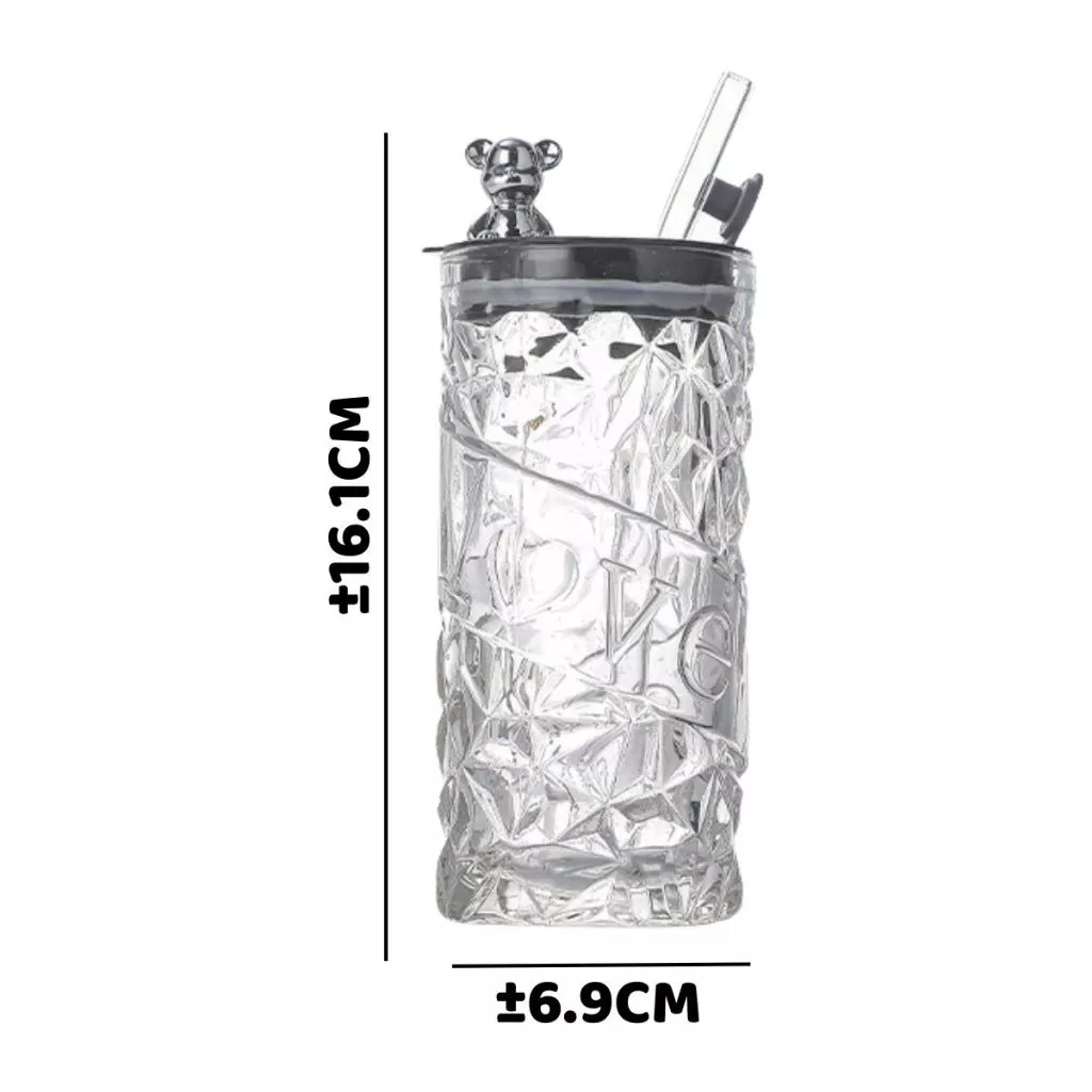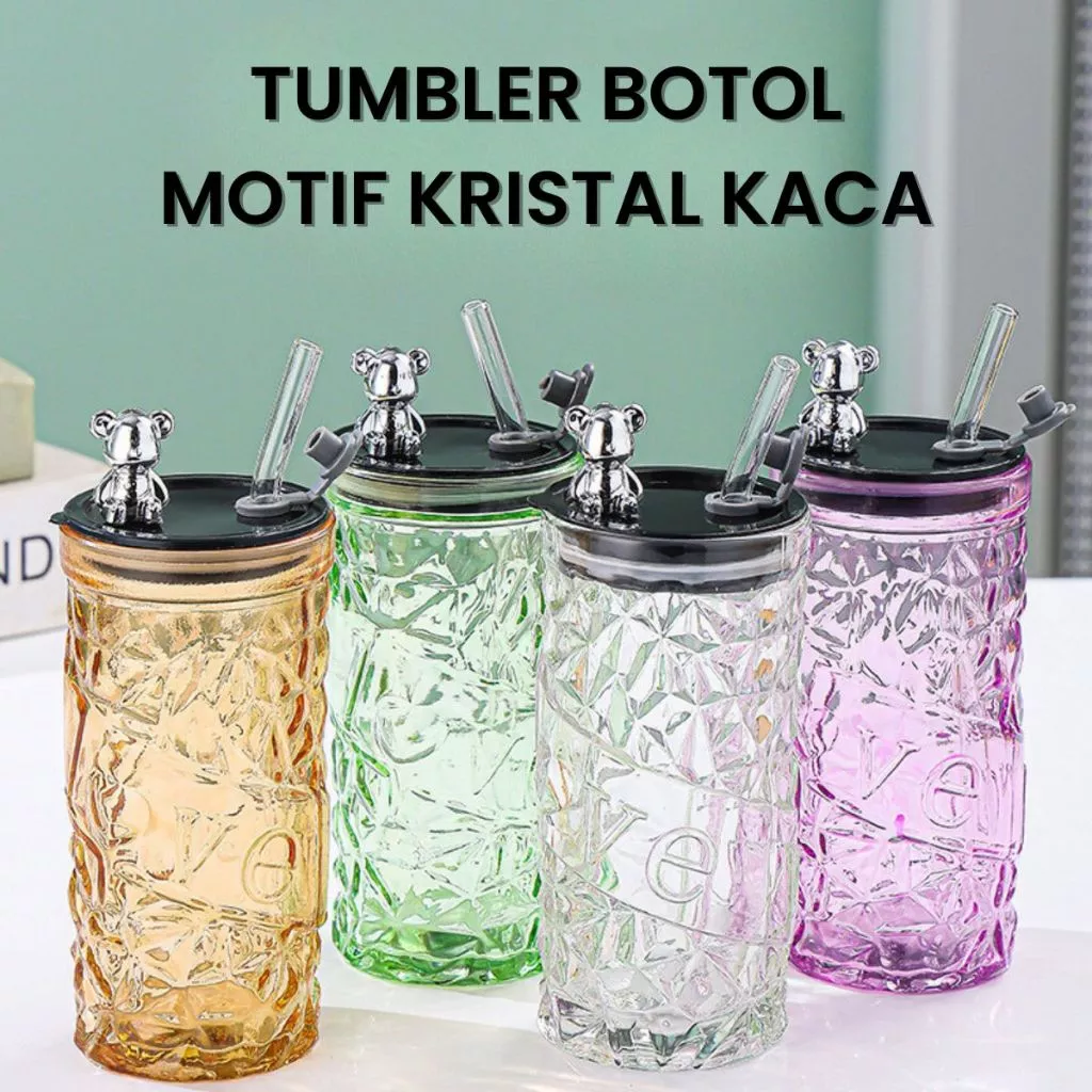 Tumbler botol kaca ini hadir dengan desain motif kristal yang elegan dan tutup berbentuk beruang yang unik.